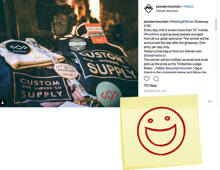 When your tagline is “preserving the pow” but it’s not snowing enough to get open and you have no snowmaking because you usually have pow, what’s a resort to do? Suck it up, face the music, and shower your customers in gifts. Powder Mountain eventually got plenty of snow, but during November and December it ran non-stop retail “giveaways until we get snow” across its channels. The effort kept its customer base engaged during the long wait for Powder’s powder, and didn’t beat around the bush of the low-snow scenario. When things are shit, admit it and do something else fun to you maintain some credibility and share of mind. The alternative would have been two months of fart-in-the-wind sales messages. Don’t be a fart in the wind. —A.K.
