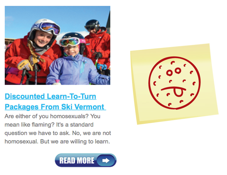 Sorry, SnoCountry. I love you, but this one was just too good an example of what can go bad, accidentally. Somehow, an excerpt from the 1981 movie “Stripes,” in which Bill Murray and Harold Ramis are applying to join the army, became the caption copy for learning to ski in Vermont. It’s a funny scene in the film, but less funny in the context of the email. Cut-and-paste goblins can strike any of us. Be on the lookout. Once you hit send, there are no backsies. Or…intentionally put some crazy, but maybe less sexual, copy into your newsletters to keep readers on their toes and maintain open rate. —A.K.