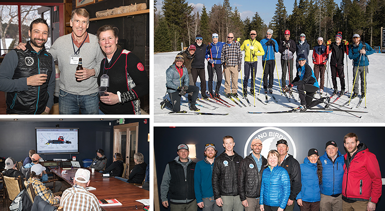The Cross Country Ski Areas Association held its annual conference in the heart of the Lake Placid Olympic venues. More than 55 attendees learned the latest on participation, research, grooming, and education. Top row, left: (L to R) Nick Mahood of Woodstock Nordic, Vt., Charles Santry of HKD, and Kelly Davis of Davis + Kaplan enjoy happy hour. Top row, right: Morning ski at Mt. Van Hoevenberg. Bottom row, left: Pro Academy in a classroom session. Bottom row, right: Pro Academy graduates. Photos: Reese Brown, CCSAA
