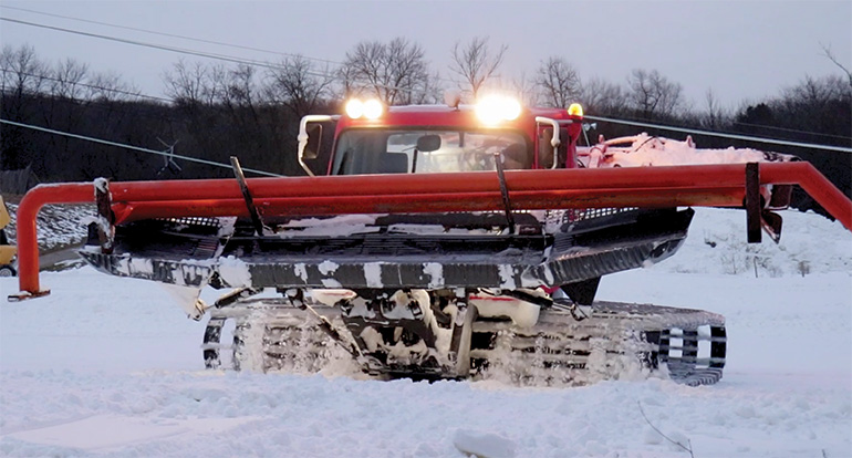 Many of the guests who visit Boston Mills and Brandywine spend at least some time in the park, so the parks have become a focus of operations. Builds are geared toward skiers and riders of all abilities. The early-season snowmaking push at Brandywine uses every snow gun in the terrain park to build the park’s most popular features: a line of three jumps that stays in place all season long. The jumps progress in size from about 15 feet to 35 feet. The mountain ops team and park crew work together to push and shape the jumps, which takes 12 to16 hours to complete. Up to two cat operators using PRINOTH Bison X and PistenBully 600 cats do the heavy lifting, and about four park crew members do the fine tuning daily, utilizing digital levels, measuring tape, rakes, and shovels.