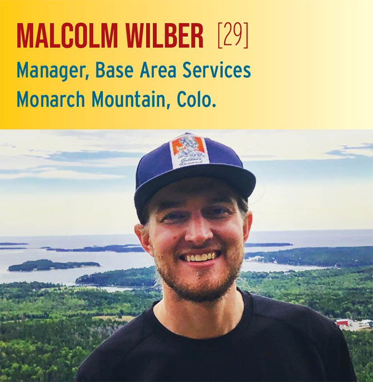 From a young age, Malcolm Wilber, 29, knew he wanted to head west and experience its outdoor recreation opportunities and wide open spaces. The Massachusetts native grew up snowboarding at Ski Butternut and attended Ithaca College, where he majored in outdoor adventure leadership. During college, he guided whitewater rafting on Colorado’s Arkansas River, near Salida, where he moved full-time shortly after graduation. He’s been full-time in base area services at nearby Monarch Mountain for the past four years, and was named manager in 2020-21.