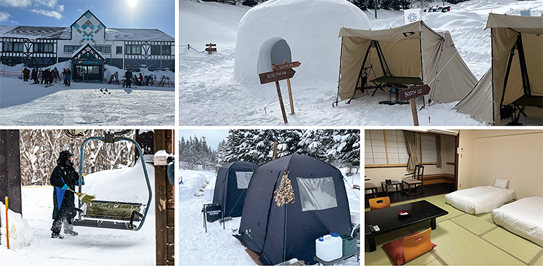 Top left: The charming base lodge at Okunakayama Resort. Bottom left: Lift attendants have an array of brooms for clearing snow from lifts, many of which in this region are fixed-grips from the ’90s. Center column: Tazawako Resort offers a snow play area complete with igloos and glamping tents where patrons can rent a fire pit and food items like s’mores; tented on-snow saunas at Tazawako offer a traditional Finnish hot and cold therapy experience. Below: Tatami mats line the floors of the traditional Japanese hotels we visited.