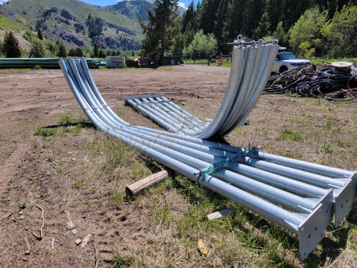 Built in 2022 but never installed. This robust trail net system is designed for 500’. Made up of 11 galvanized steel “umbrella” style towers. Each tower is 16’5” and mounted to steel base buried in 6’w x 6’l x 3’d hole. The 5 x 103’ Nets are made of green 7mm poly twine with nylon thimbles on corners, 5/8” rope border. A ground cable is used to attach net to ground. Comes complete with all hardware. Offers for smaller sections will be considered. Shipping and installation not included. For pricing and additional information call 800-555-0593 or email